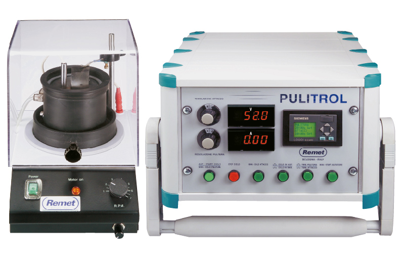 PULITROL  - автоматическое устройство для электролитического полирования и травления образцов из всех видов сплавов. Состоит из источника питания и блока травления и полирования с емкостью для электролита и магнитным регулятором потока электролита. Параметры обработки легко настраиваются: регулируются напряжение и ток полировки или травления и время обработки. Все параметры отображаются на цифровом дисплее. PULITROL может работать отдельно в режиме полировки, отдельно в режиме травления или автоматически переключаться с режима на режим.  Образец помещается в ячейку травления поверх пластиковой  маски и прижимается регулируемым анодом. В ячейку подается небольшое количество электролита. Поток  и температура электролита  регулируются автоматически. Водяная система охлаждения. Коррозионностойкое исполнение.  PULITROL полностью соответствует европейским нормам безопасности. Комплектуется электролитами. При необходимости комплектуется портативным модулем для травления.
